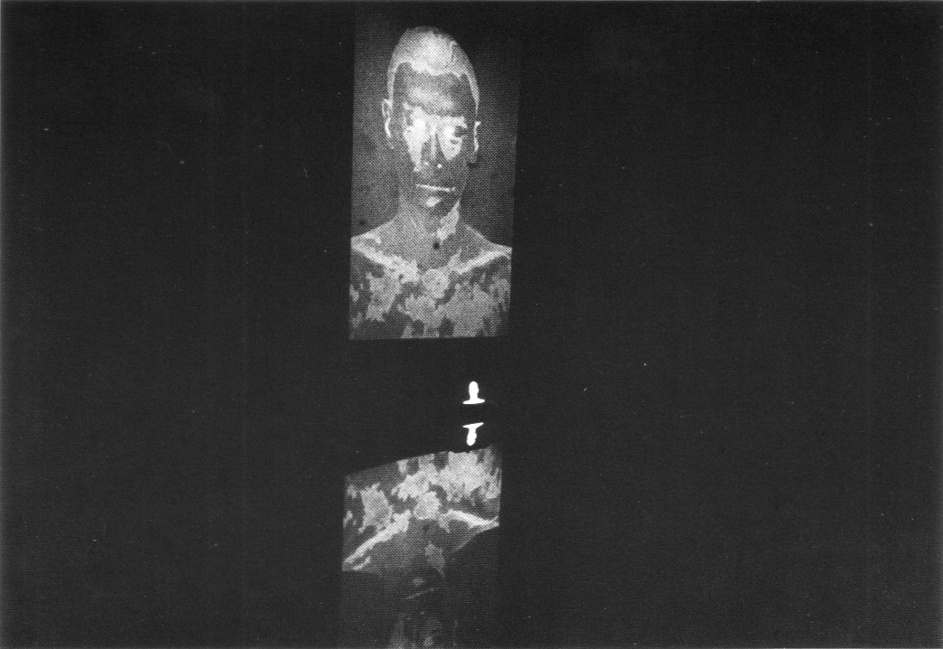 A colour-negative of Boegel's face covered with clay is projected on the wall of the galery. This image is reflected in the water of a bassin built on the floor of the room.
