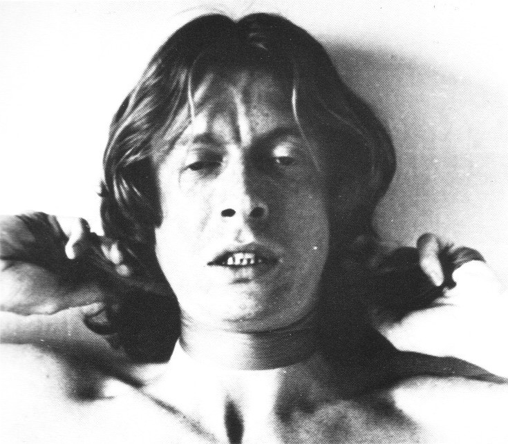 On camera, Boegel is gasping for air, because he is preventing himself from being able to breathe. He is blocking his airways by stuffing them with fabric. Unlike the other Atmung works, in which the lack of air develops very gradually, here, the gag speeds up the process remarkably. Boegel's eyes are bulging through lack of oxygen, and all his blood goes to his head, making it swell up.
