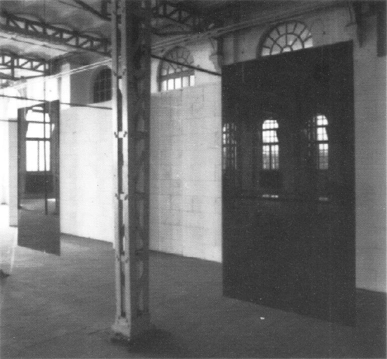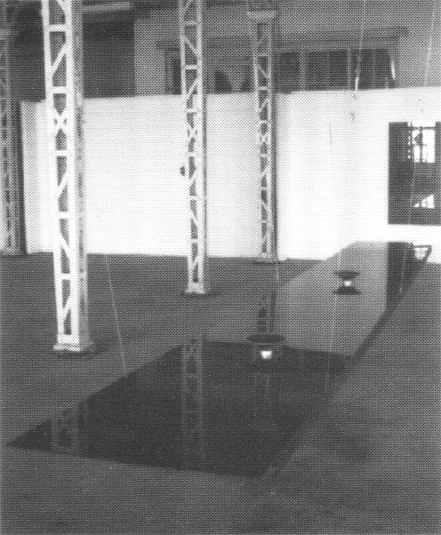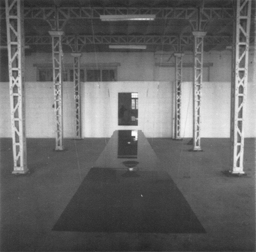 A long, black glass table (6 m. x 1 m. ) is suspended between the cast iron pillars. Loudspeakers are mounted on the table and on the two pillars. A contact microphone picks up the resonance of the loudspeakers on the table and this sound is relayed though the loudspeakers on the pillars. The entire cast iron structure of the hall functions as a resonator, and the visitor can perceive this by placing his or her ear against one of the pillars.